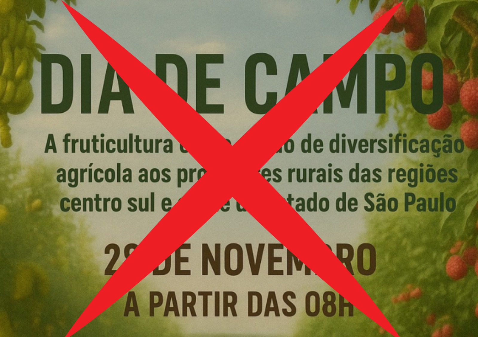 O cancelamento ocorre em consequência da tempestade acontecida no dia 23 de novembro no município de São Manuel. O alto índice pluvial (130mm de precipitação) acompanhado de chuva de granizo causou severos danos tanto nos plantios de frutíferas e olerícolas cultivados a céu aberto quanto nos cultivos protegidos, impossibilitando a realização do Dia de Campo, que teria a colaboração de: Sindicato Rural de Botucatu, Serviço Nacional de Aprendizagem Rural (Senar), Coordenadoria de Assistência Técnica Integral (CATI) e Prefeitura Municipal de Botucatu.